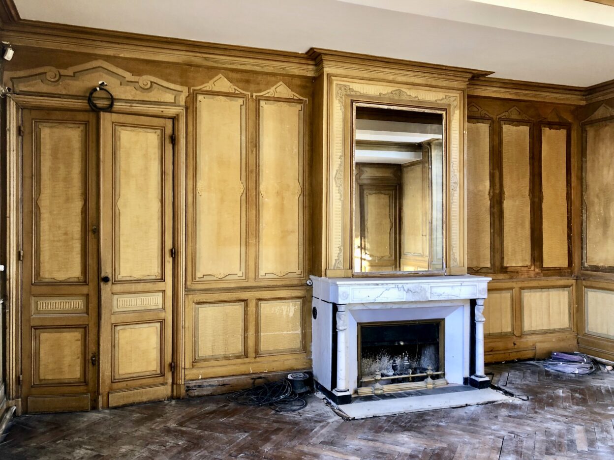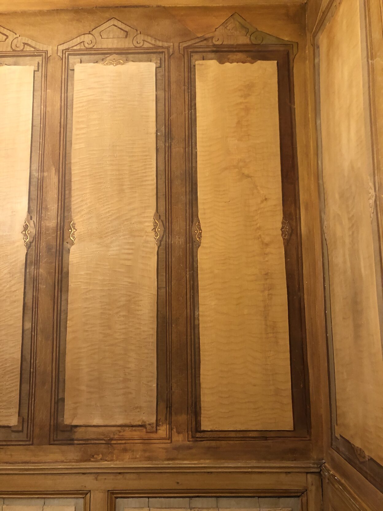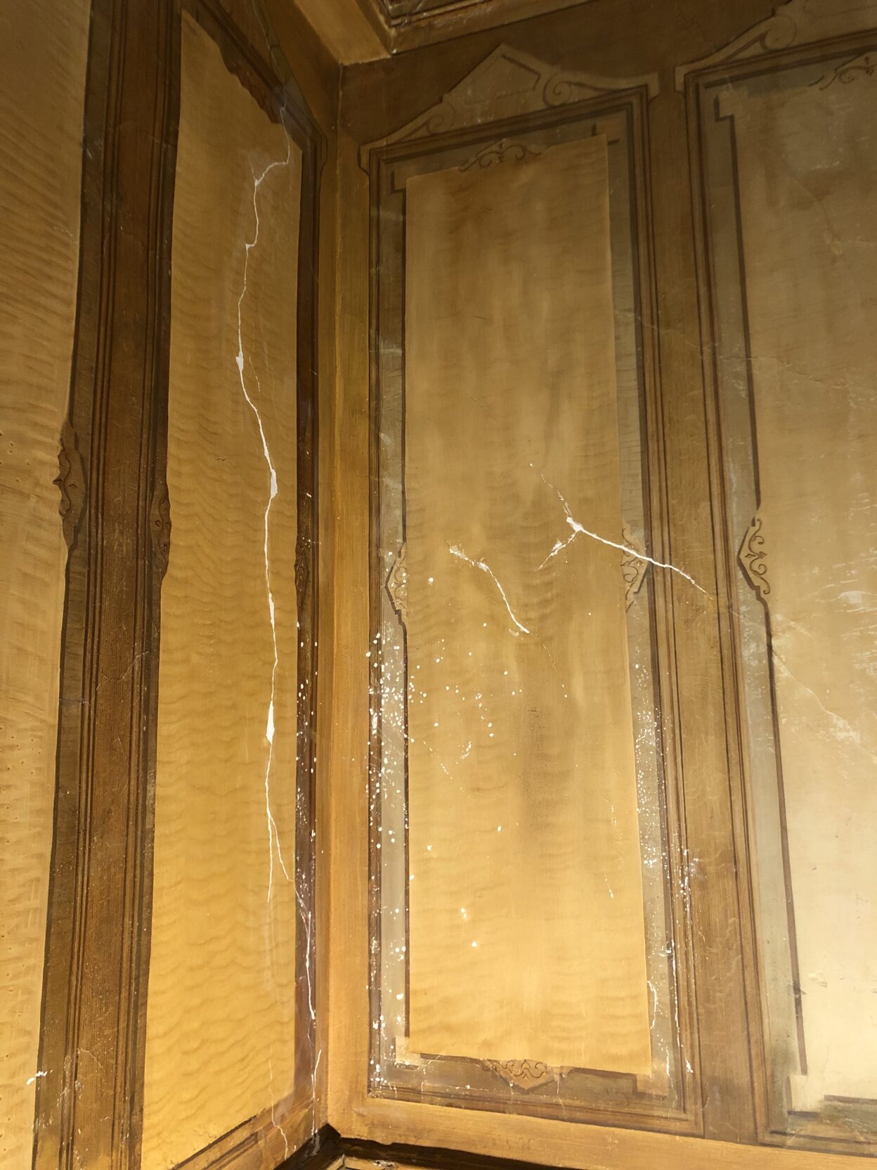 À la suite des mouvements de la bâtisse des fissures sont apparues sur les murs provoquant des dégâts sur les décors. Il a donc fallu consolider les décors, traiter les fissures et procéder à la réintégration picturale des faux bois.