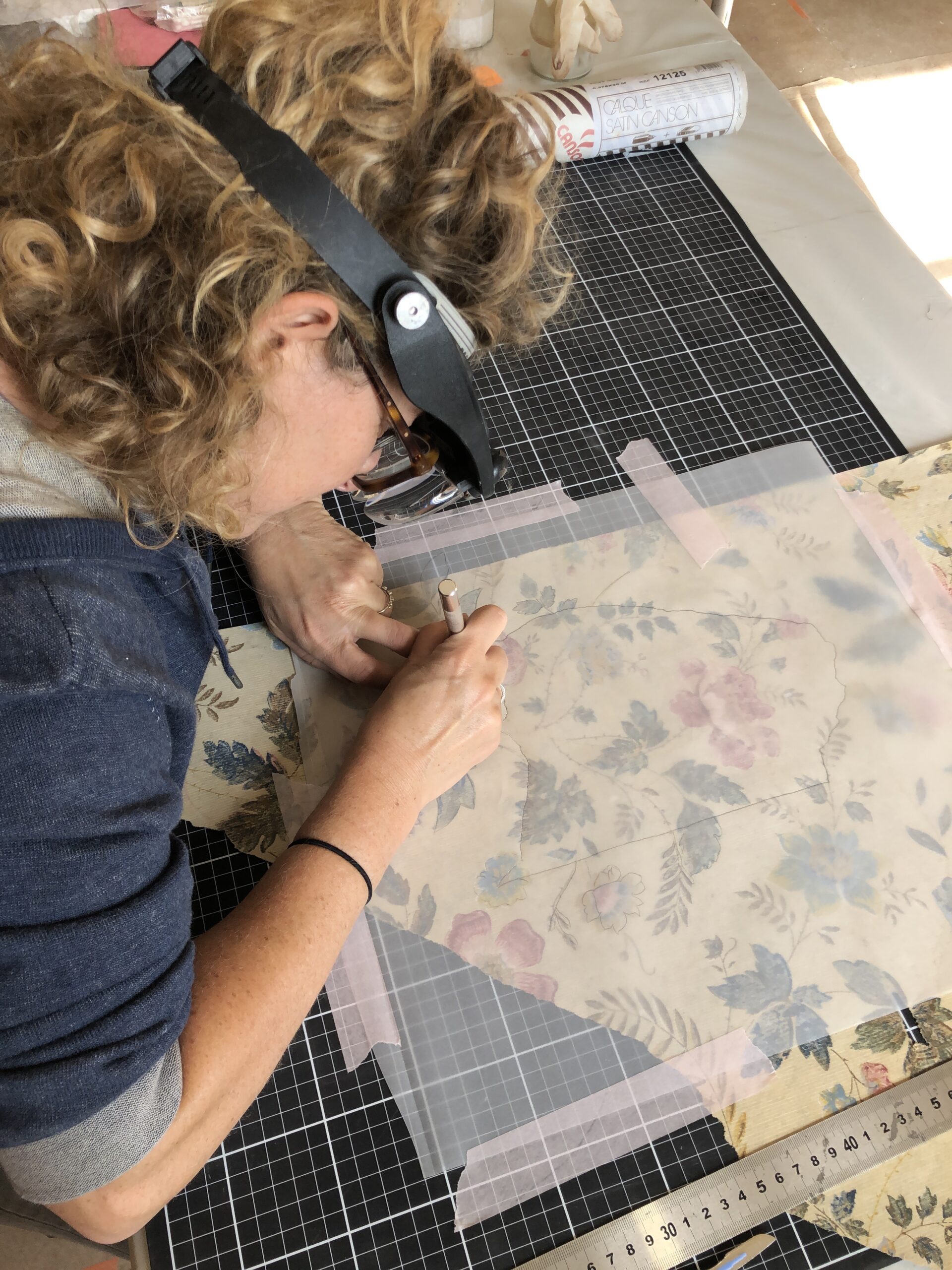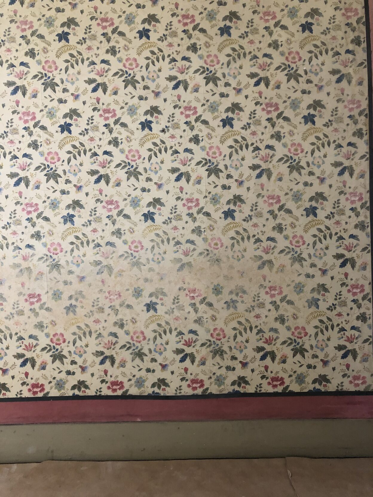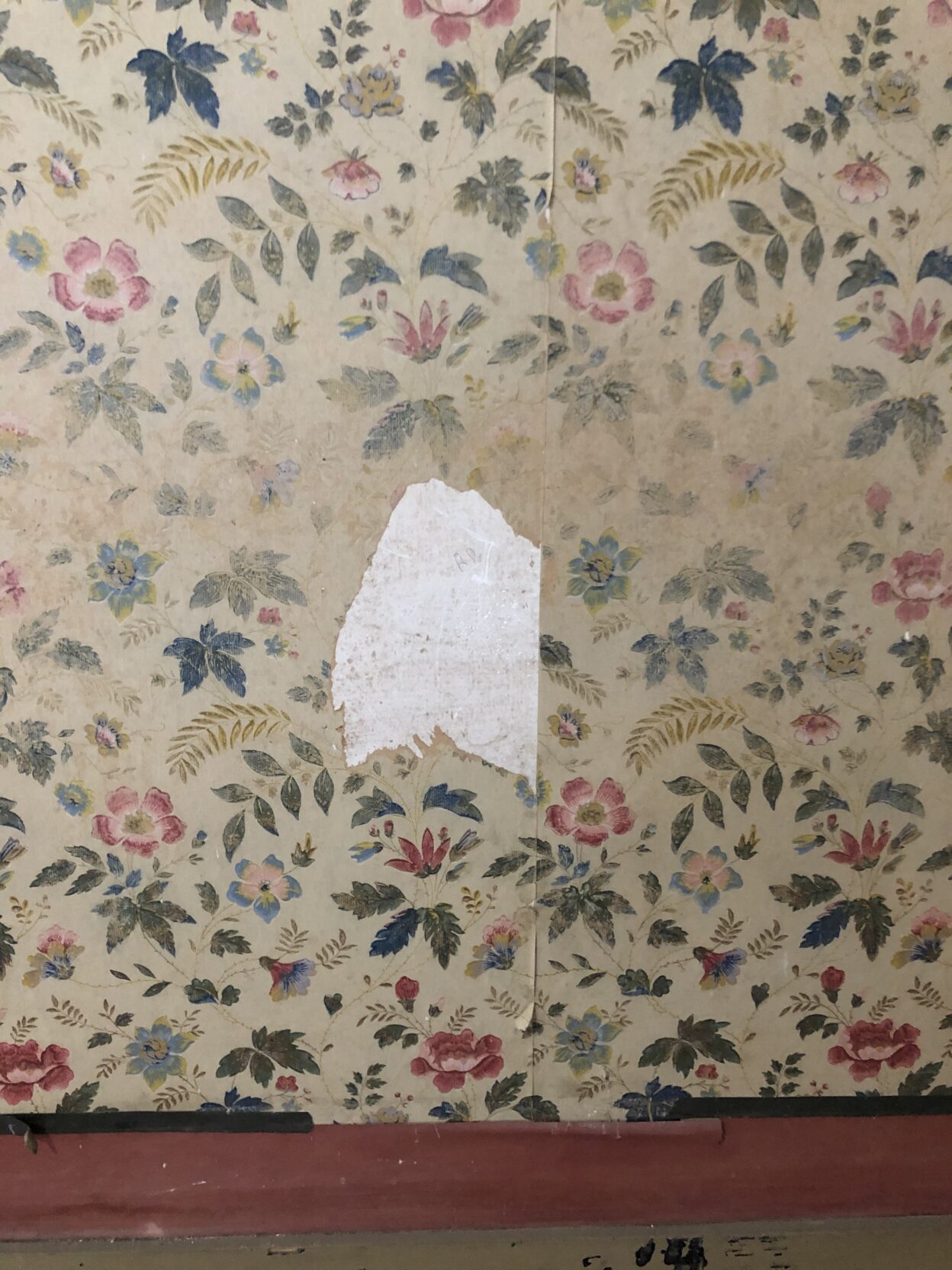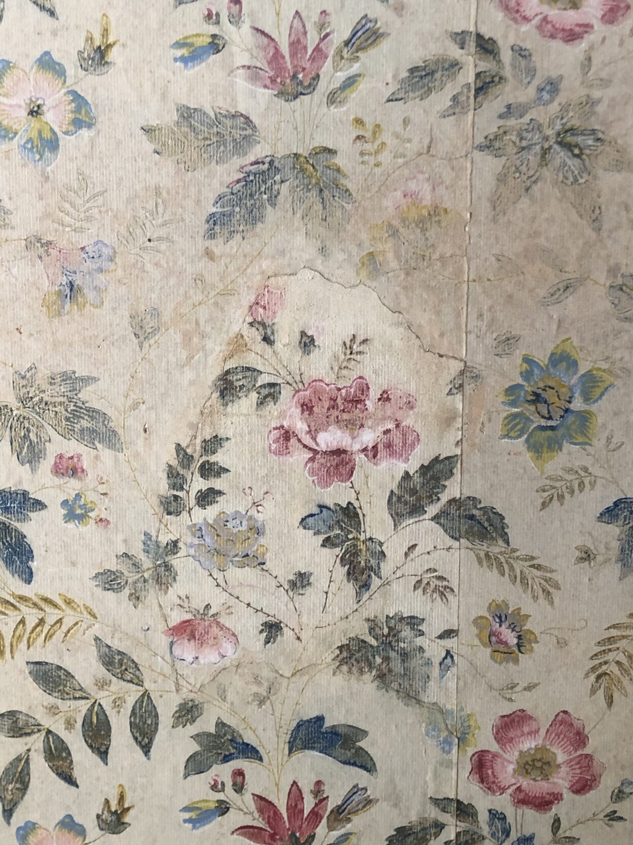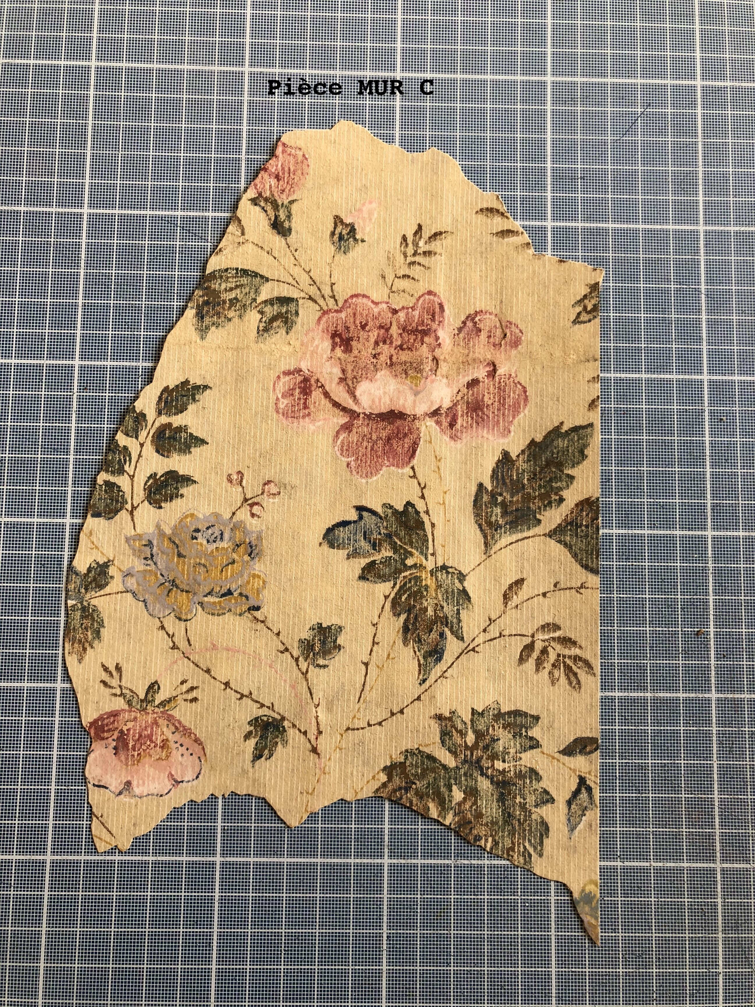 J’ai découvert sous les lés déjà en place, des morceaux de décors identiques qui m’ont permis de réaliser une incrustation à insérer à la place du manque. Le raccordement des motifs à la gouache et le travail d’harmonisation avec le reste du décor permettent d’obtenir un ensemble visuellement esthétique.